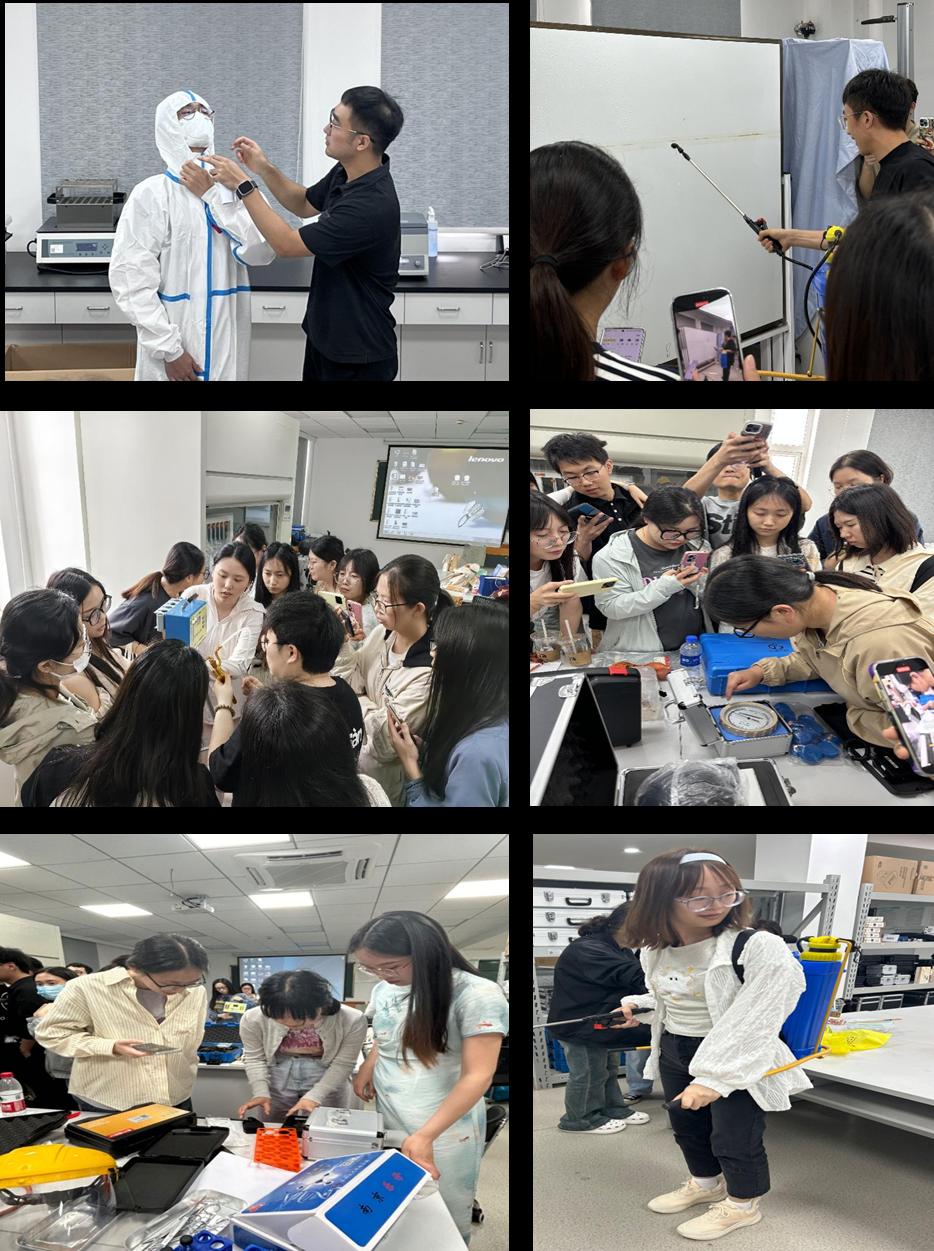 第一模块介绍防护用品的穿脱顺序及操作规范,课堂生动活泼又不失严谨。这不仅是考试的操作重点,也是公卫学子在从业过程中非常重要的技能。第二模块从消毒、杀虫、灭鼠、针刺伤处置及手卫生等部分讲解,包括消毒剂的配制与使用,对消毒用品浓度的计算,消杀设备使用操作等。第三模块主要讲解生活饮用水样品采集、室内空气样品采集、公共用品用具样品采集的操作步骤,并就噪声测定仪、风速仪、照度计等仪器的使用和操作要点进行示范。第四模块就固体食品和液体食品采样以及餐饮具的采样过程做了详细解说。第五模块主要介绍生产性粉尘样品采集、化学毒物样品采集、工作场所噪声测量及游泳池水样品采集。