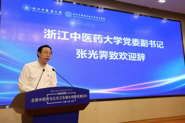 张光霁致欢迎辞。他指出,公司坚持以传承创新发展中医药为己任,同时注重发挥中医药特色优势,加强公共卫生与预防医学团队建设。此次论坛的召开,旨在进一步强化中医药特色预防医学人才培养,推进中医药传承及与预防医学的融合创新,为服务健康中国建设提供学习交流的平台。