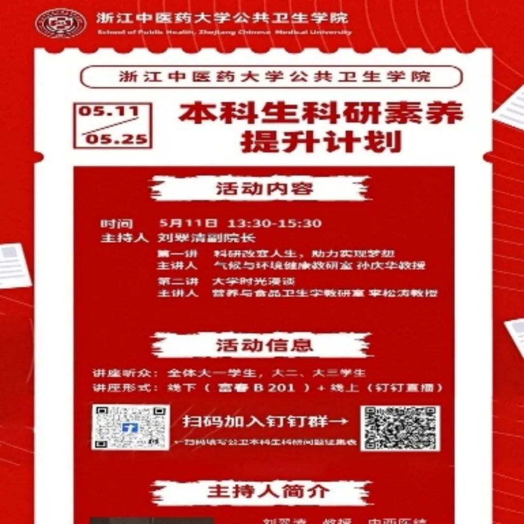 承办“浙”里谈本科生科研素养提升计划,培养本科生的创新意识与科研素养,承办文献检索大赛、预防医学知识竞赛、名家论坛活动。