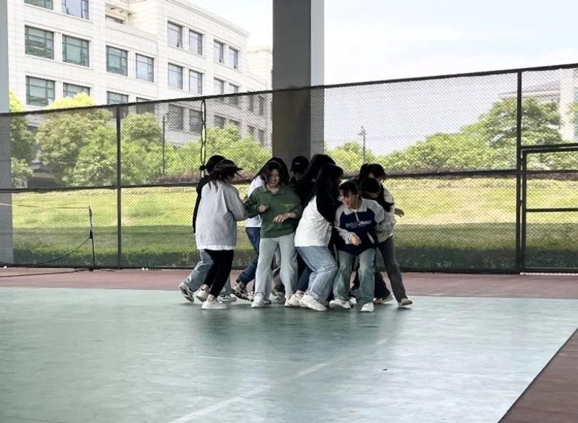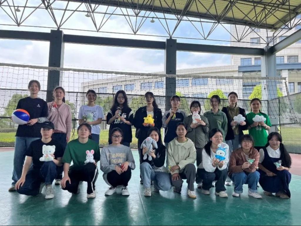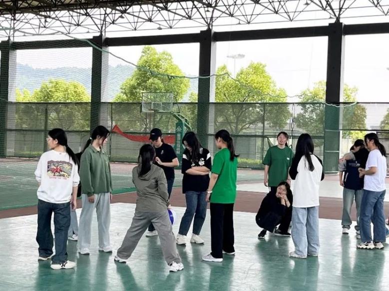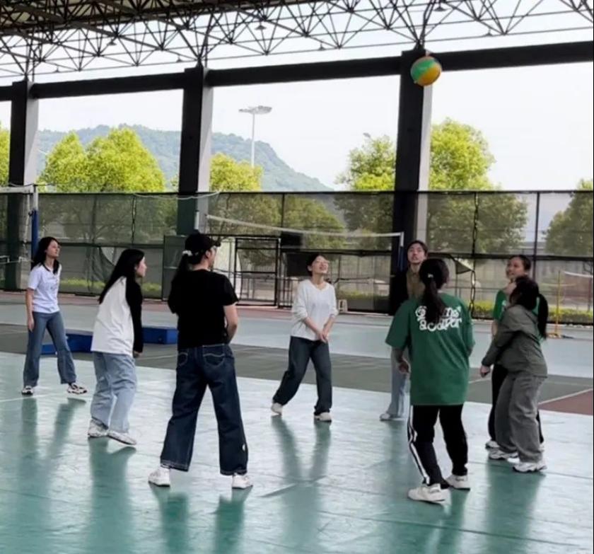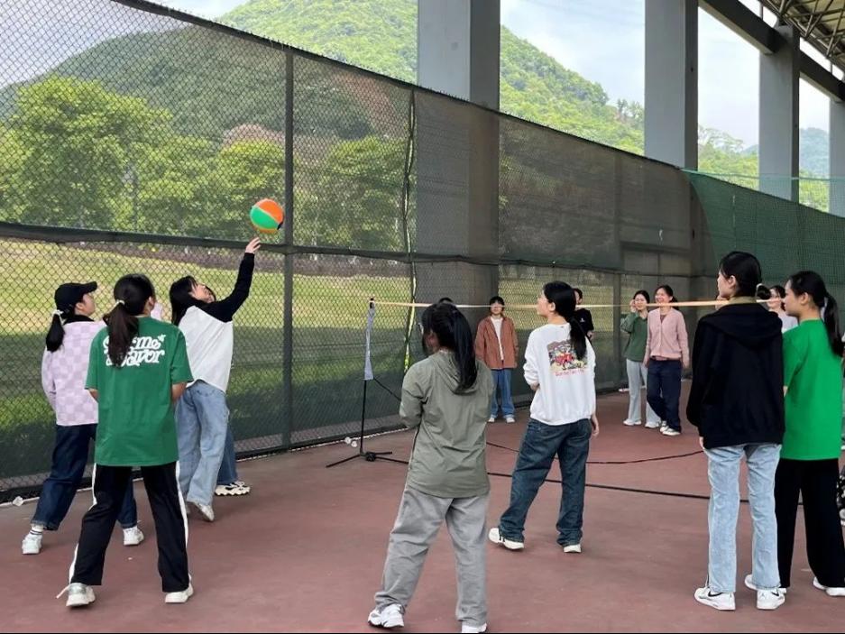 夏天、大海、沙滩,这三个词似乎提起一个就能勾起另两个,在富春的排球场上来虚拟一场沙滩排球吧!两队站在排球场两侧打充气沙滩球,不限打击次数与接球部位,没接住球方失败。一共进行三个回合,每次获胜方得5分。即使没有沙滩,大家也热情不减,打得气氛火热。