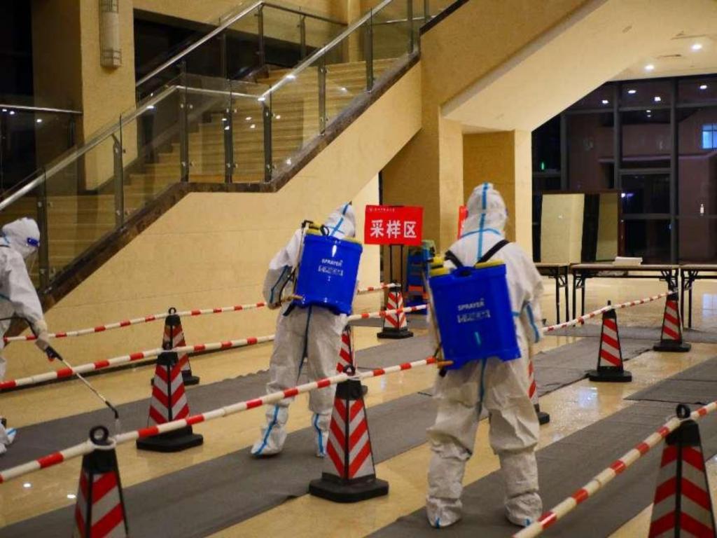在富春校区,志愿者们来到蓝房子的核酸采样点、隔离点进行消杀,穿戴好防护服并使用专业的工具,严格按照要求有序进行活动。