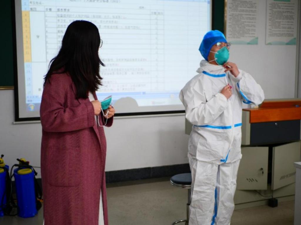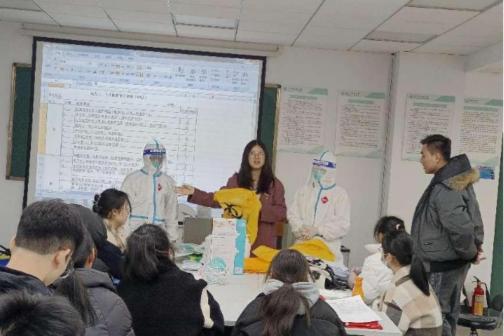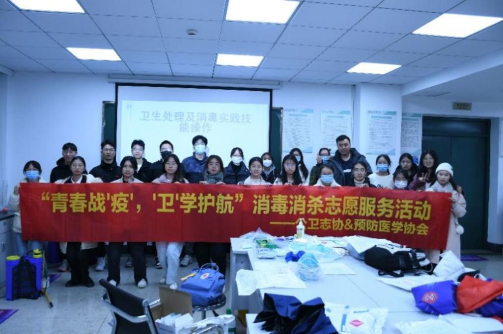 活动前期,气候变化与健康教研室、预防医学协会指导老师吴玥老师对各位志愿者进行了系统的培训,指导同学熟悉各种类型的消毒液,带领大家学习如何正确穿戴面罩、手套、口罩、隔离服以及规范使用消杀用具。