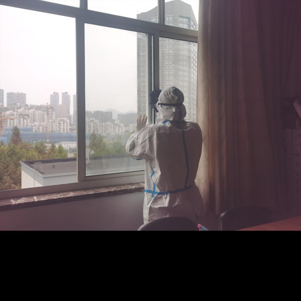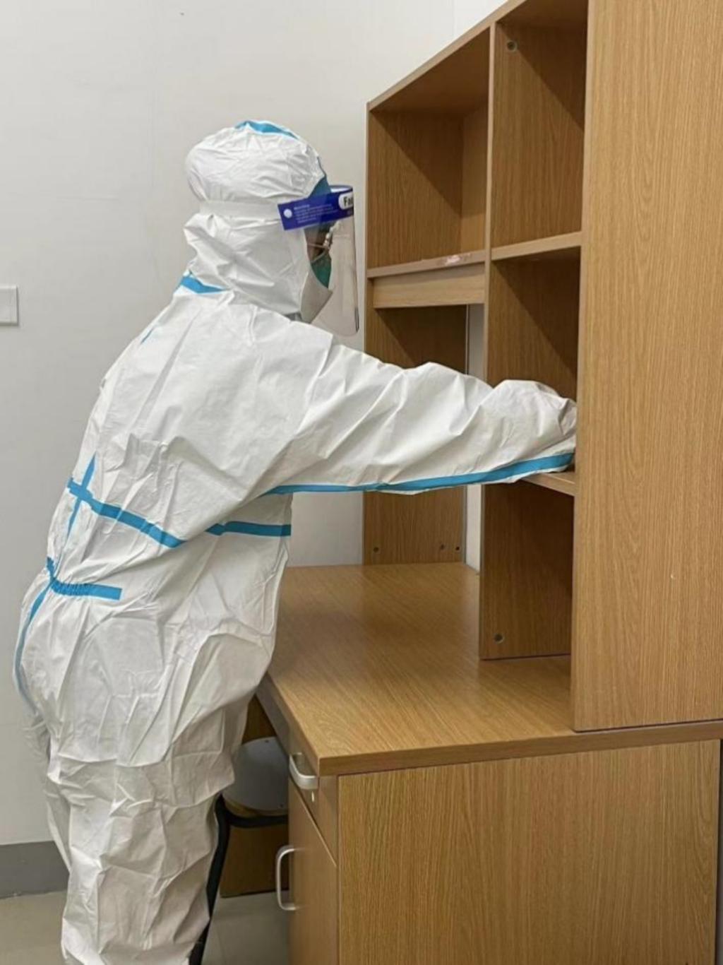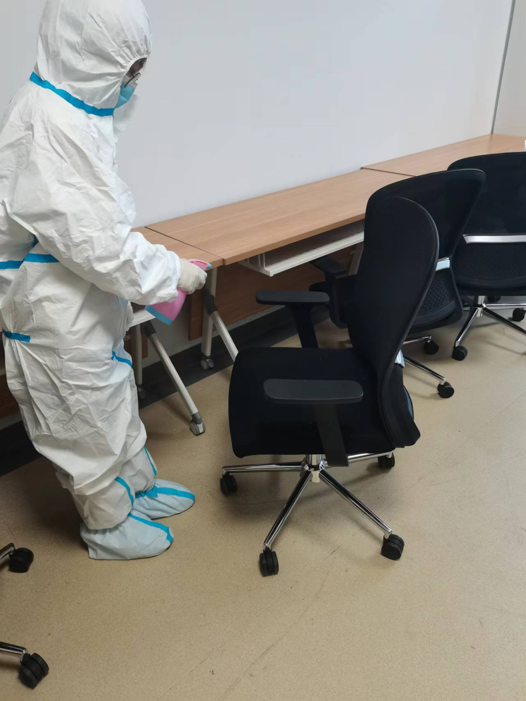 在滨文校区,志愿者们于约定时间前往教职工办公室进行消杀。在对房间进行彻底清扫和清理垃圾污物后,用消毒液对办公室进行全方位消毒并用清水二次擦拭、擦干残液。在消杀工作完成后,进行开窗通风,让气味消散。