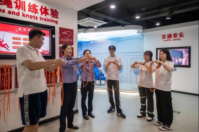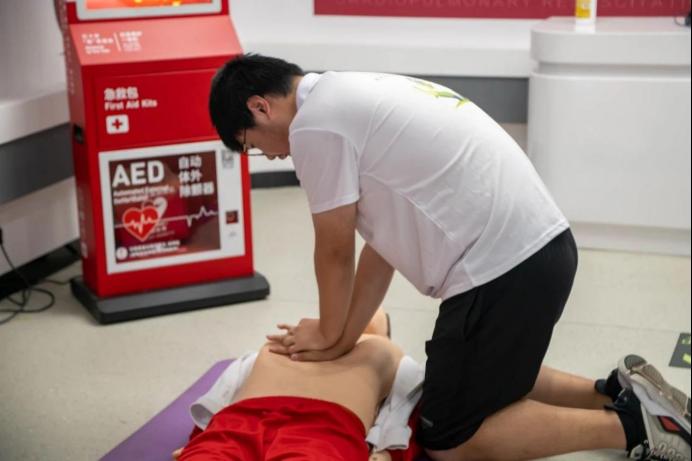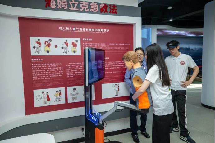 在讲解员的示范下,学员们在应急救护体验区,开启沉浸式体验,通过智能化平台进行安全知识学习,不仅了解了烟雾逃生通道的正确姿势,还掌握了灭火装置的恰当选择和打开方式,在体验中增强安全意识,为自己和他人撑开“保护伞”。在场馆内,团队成员还进行了心肺复苏练习,在讲解员的指导下,老师和同学们积极学习,将理论与实践相结合,现场进行了心肺复苏操作,以及除颤仪的正确使用。