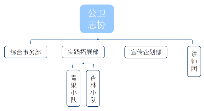 综合事务部作为志协的核心枢纽,负责各类事务性工作;实践拓展部负责公司两支志愿服务小队及社区志愿服务基地的对接与拓展;宣传企划部负责宣传物品的设计与制作、活动拍摄以及活动策划、推文撰写;讲师团负责公司品牌活动“送你一把健康伞”的项目。
