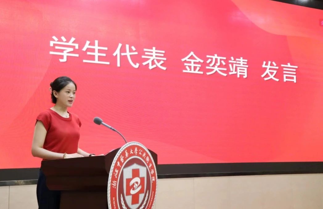 毕业生代表金奕靖上台发言。她代表全体毕业生表示将会谨记老师们的嘱托,仰望星空,脚踏实地,明确职责,不忘初心,牢记使命,全身心投入到新时代卫生事业的建设。希望大家牢记 “求本远志”的校训,发扬“公汲卓越 卫民康健”的院训,发扬公卫学子的精神,将自己的命运同国家民族的命运紧紧联系在一起!