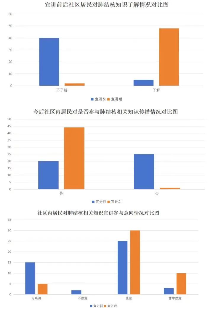 在宣教活动后,实践团队通过设计发放后评估问卷,针对参与活动的居民进行匿名调查,纵向对比宣讲前后居民对结核病知识掌握程度的提升,横向对比不同社区、不同年龄段人群的宣教效果差异。根据问卷数据统计,居民对于结核病基本知识的了解和防治意识显著提升,大多数居民表示将会积极采取预防措施,并将所学知识继续传播给家人朋友,惠及更多人群。实践团通过后评估机制,形成“宣讲-评估-反馈-优化”的闭环,确保宣教工作的持续性和有效性。
