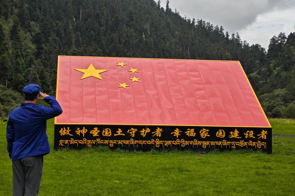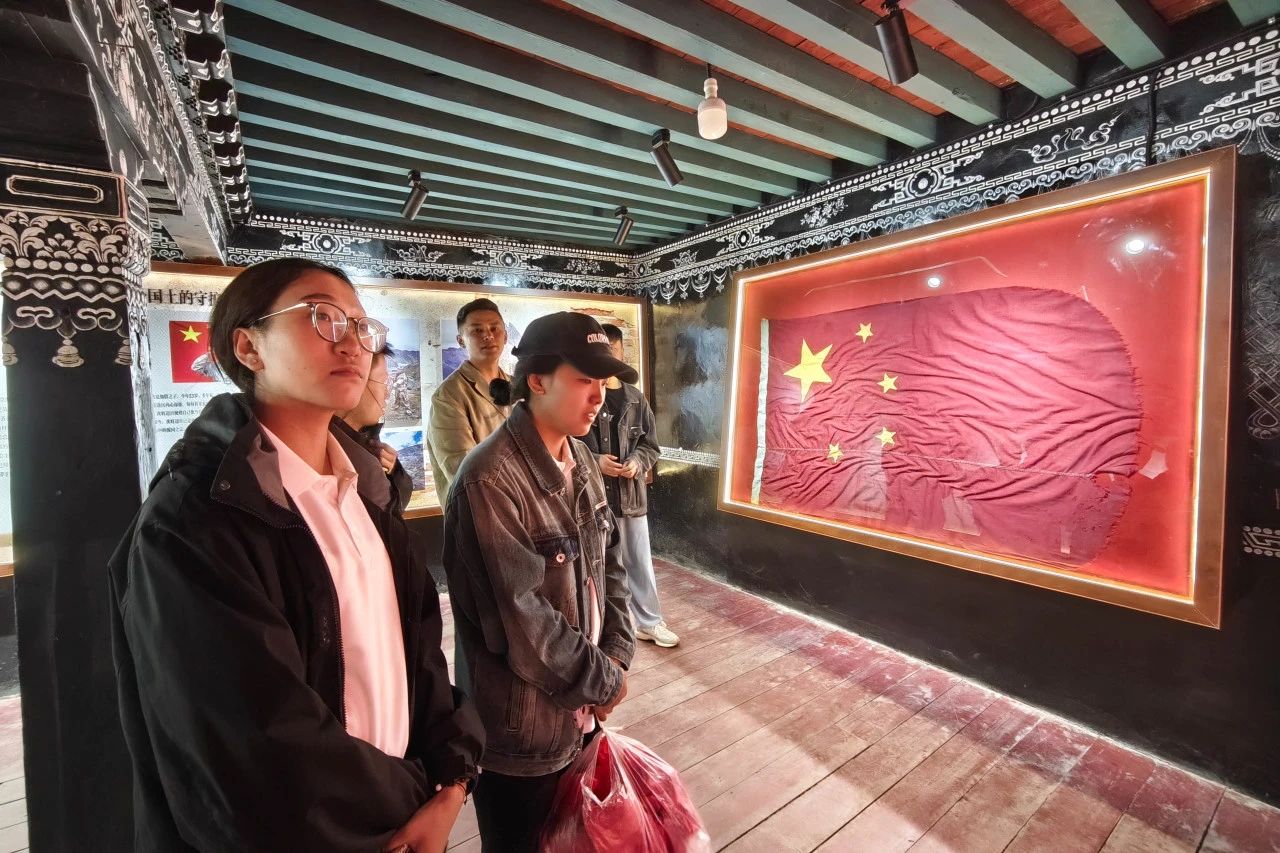 在三代人国旗情厅,一面手工缝制的五星红旗格外引人注目。这是上世纪80年代,由第二代传承者白玛拉姆亲手缝制的。一家三代的国旗情缘不断延续,加措时常教育儿女:“我们一家人现在的幸福生活,是先辈们跟着共产党走、在祖国大家庭中才有的。”这些话让在场的每一个人都深受感动。