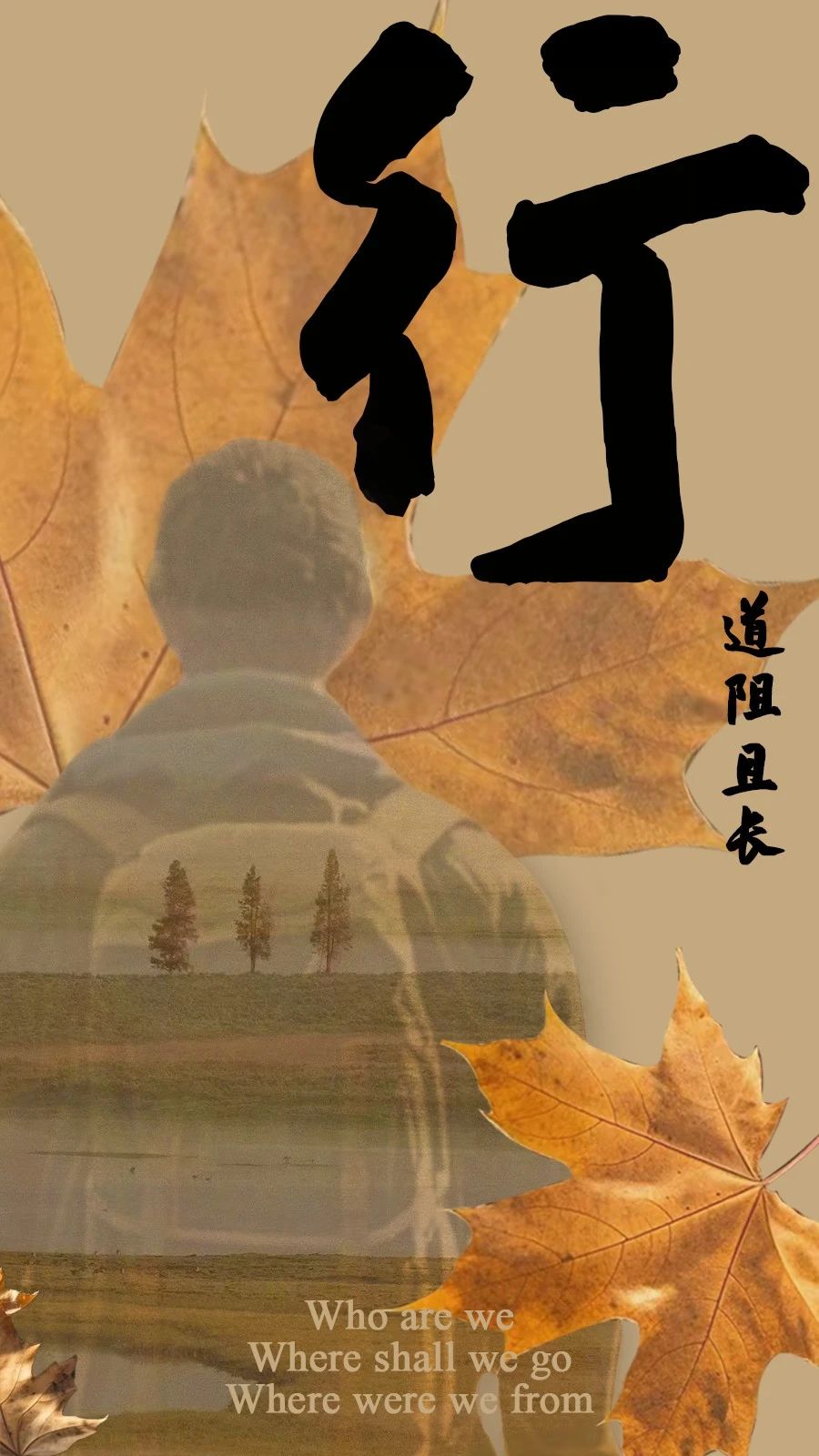 该设计以大地黄为底色,以一个人背包远去的背影为主体,看似孤独,却饱含满腔热血,在其中嵌入了广阔的田野,意味着出发前往的美好旅途,广袤而富有生机。前进的道路上,我们或孤身或结伴,似落叶随风飘落,归根,又再次扬起。以枫叶作为背景物,意味着过去的故事,右下角的落叶意在“随风起,随风落”。《行者·吾身》重在行,而行——道阻且长,变成了文字主体。英文三问“是谁,从哪里来,到哪里去”也是对这一主题的深入思考。