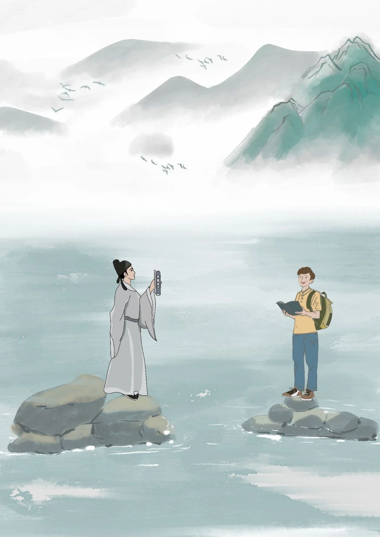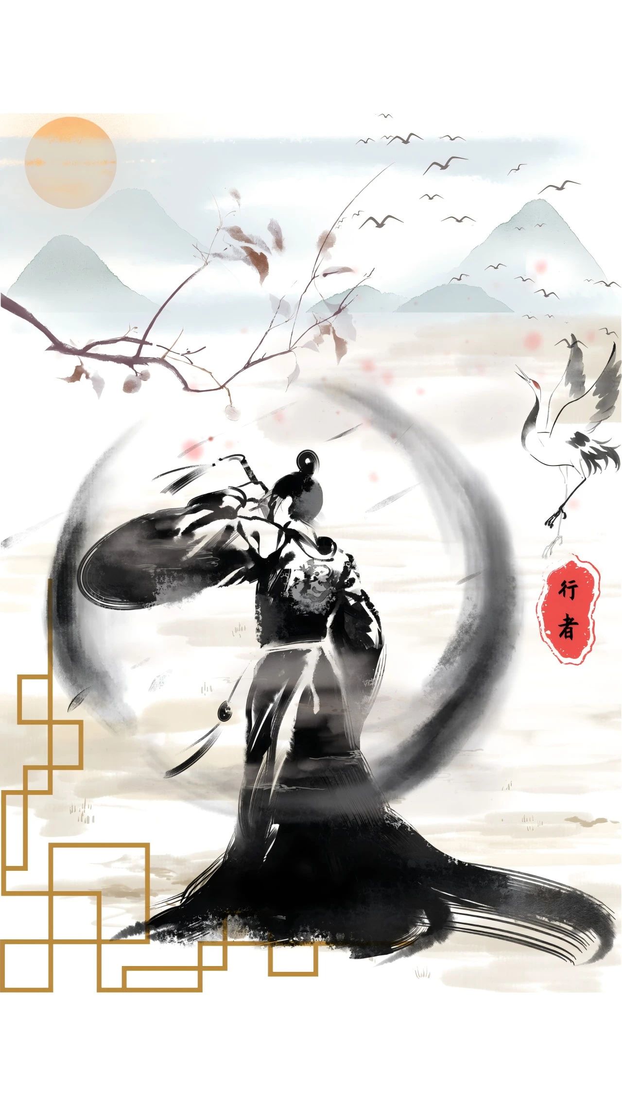 这幅画是一幅充满中国风的水墨画,画面中有两个人物,背景是山水和飞鸟,营造出一种宁静致远的氛围。人物:画中有两个人物,分别站在两块石头上。左边的人物穿着古代服饰,手持一把剑,似乎在凝视远方,给人一种古代侠客或文人的感觉。右边的人物则穿着现代服装,背着背包,手里拿着一本书,似乎在阅读或思考,代表现代的旅行者或学者。背景:背景是典型的中国山水画风格,有朦胧的山峦和缥缈的云雾,几只飞鸟在空中飞翔,增加了画面的生动感。色彩:整体色调以淡雅为主,使用了水墨画常见的黑白灰和淡绿色,给人一种清新脱俗的感觉。意境:这幅画通过古代与现代人物的对比,可能在表达时间的流转和文化的传承。