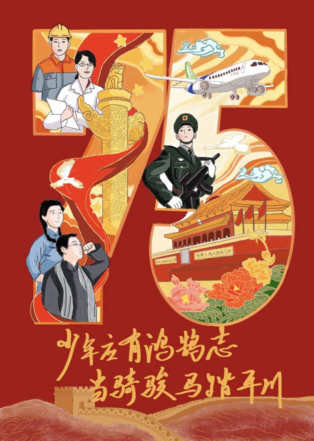 2024年是新中国成立75周年,此画以“7”“5”两个数字为基础,画中包含了天安门广场、和平鸽、长城、五位新中国成立以来为中华民族而奋斗的各行各业人士等元素。“少年应有鸿鹄志,当骑骏马踏平川”是古人立下的誓言,他们以青春之热血,诠释了少年的鸿鹄之志。它也适用于现在的我们,我们也应骑骏马,破风浪,展豪情,发挥自己的专业优势,为实现自己的理想和国家的繁荣而努力拼搏。愿祖国繁荣昌盛,国泰民安,携手共创未来新篇章。