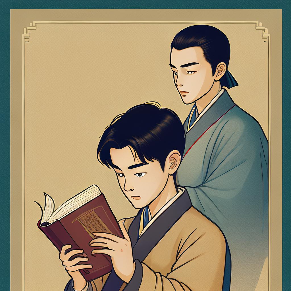 画面中央是一位现代少年,身穿古代服饰,手中捧着一本古代书籍,神情专注。少年的身后,一位古代智者以半透明的形象出现,身着汉服,目光温和地注视着少年,仿佛在传递着跨越时空的智慧。