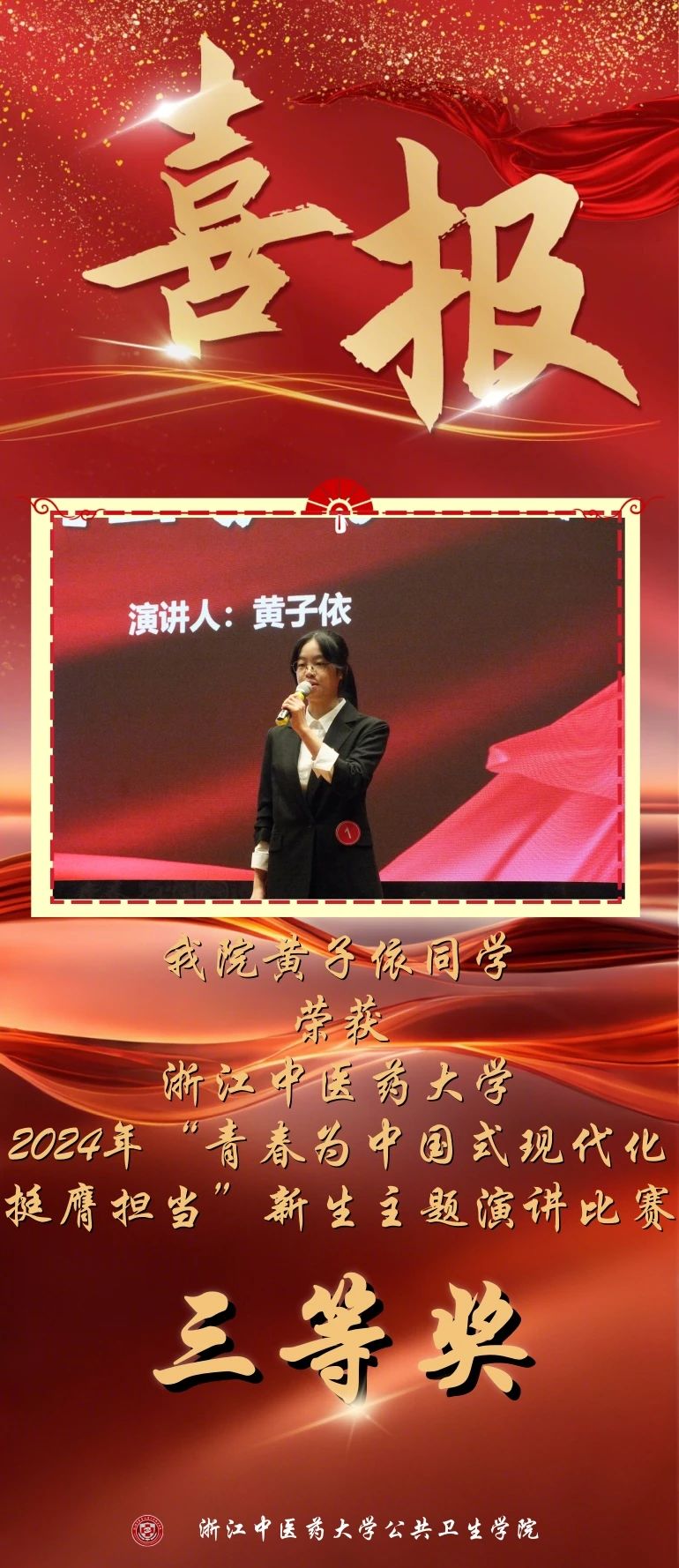 喜报!公司黄子依同学荣获校新生演讲比赛三等奖!