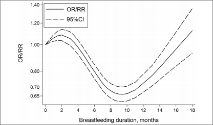 图1母乳喂养与儿童白血病的剂量-反应关系