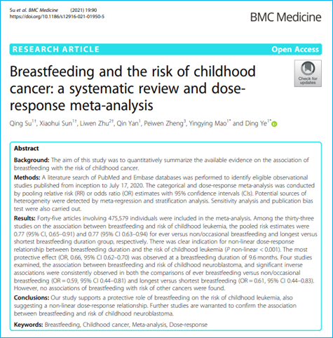 近日,1xBET2016级预防医学本科生苏晴作为第一作者,在BMC Medicine(中科院一区Top期刊,IF: 6.782)发表论文《Breastfeeding and the risk of childhood cancer: a systematic review and dose-response meta-analysis》,青年教师叶丁博士为本文的通讯作者。