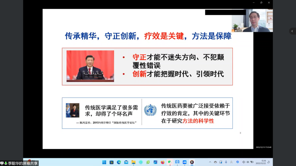 天津中医药大学中医药研究院的张俊华教授结合中医药研究的特点以及自身循证中医药的研究经历,分享了循证中医药研究经验,提出开展研究要提出好的问题(有需求、有价值、可解决),申请书撰写时要有好的摘要和路线图;同时要注重积累工作基础和研究条件,以及建立良好的合作团队。