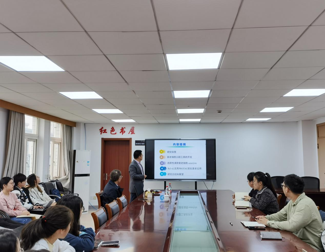 当日,何永捍研究员作了主题为“衰老细胞示踪及senolytic小分子(PROTAC)的应用”讲座。何老师首先介绍了细胞衰老及其生物学意义,总结了不同的衰老定性、定量检测方法,并重点讲述SA-β-Gal的红外探针体内示踪体系,由细胞层面深入至个体层面,通过时间、效应、特异性三个维度,采用多种细胞进行验证,思路严谨缜密。同时,何老师还制定了抗衰老策略,紧跟当今科研热点,结合senolytic靶点研究现状提出最新挑战。该研究以“PROTAC”为药理研究对象,以“泛素-蛋白酶体系统”为切入点,富有创新性和完整性。