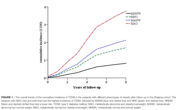 肥胖可以增加Ⅱ型糖尿病、心脑血管疾病等慢性病的发生风险。肥胖有代谢异质性,虽然既往已有研究对不同肥胖代谢表型人群的糖尿病发生风险进行探究,但多数研究结果都在强调代谢异常肥胖(MAO)人群发生糖尿病风险最大,却忽略了对“瘦胖子”(代谢异常体重正常,MANW)人群的关注。对于代谢正常肥胖(MNO)者发生糖尿病的风险研究结果也并不一致,尤其缺少大型人群特别是中国人群的相关研究。本文通过对浙江代谢综合征队列17,238名研究对象的前瞻性队列研究(2010-2014),探究不同肥胖代谢表型与Ⅱ型糖尿病发生风险之间的关系。