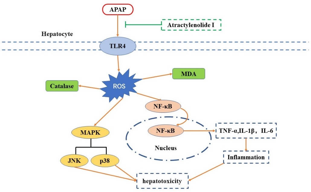 近年来,一些中药和中药活性成分被认为对预防和治疗APAP病有效。该研究以传统中药白术的主要活性成分白术内酯I(Atractylenolide I , AO-I)为研究对象,结果表明AO-I可显著改善APAP诱导的丙氨酸转氨酶、天冬氨酸转氨酶和肝脏活组织检查的组织学评分(SUZUKI评分)升高,有效缓解APAP诱导的肝损伤。AO-I防治APAP诱导的肝损伤可能是通过TLR4/MAPKs/NF-κB介导的抗炎和抗氧化活性实现的。该研究支持了AO-I作为防治APAP肝损伤的有效药物的潜力。