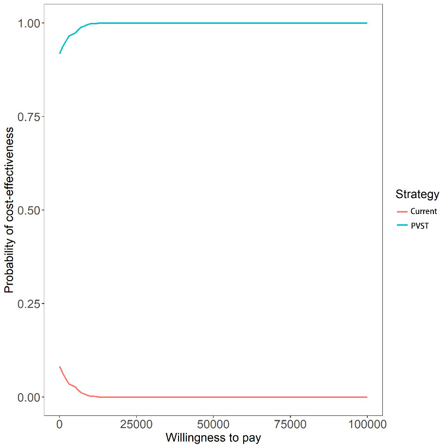 结果显示PVST策略的ICER为−4130.18元/QALY,总计节省约3809546元,并可减少922.37个QALY的损失。成本-效果可接受曲线显示在浙江省人均GDP 107624元的情况下,开展PVST是100%具有卫生经济学效果的。该文章为浙江省开展全省范围PVST提供了一定的科学支持。
