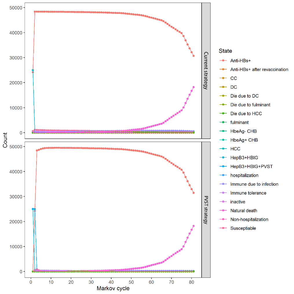 该文章基于R构建了一个Markov模型来评估乙肝表面抗原阳性母亲所生婴儿开展PVST的成本-效果。模型通过建立50000高危新生儿的虚拟队列,进行81个生命周期的循环,计算接受PVST与不接受PVST相比的增量成本效果(ICER),并通过单因素敏感性分析和概率敏感性分析探讨结局的稳定性。