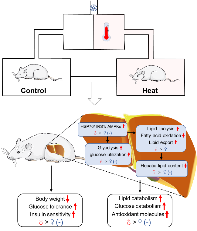 结果显示雄性小鼠比雌性小鼠更容易受到间歇性热暴露的影响,主要表现为雄性小鼠在间歇性热暴露环境中出现体重减轻、空腹血糖水平降低及胰岛素敏感性增加等现象,而雌性小鼠未见改变。间歇性热暴露显著降低了雄性小鼠肝脏重量及甘油三酯含量,但雌性小鼠和雄性小鼠的肝功能未受影响。深入探究其机制发现,间歇性热暴露主要通过促进脂肪酸摄取、甘油三酯分解、脂肪酸β氧化及脂质外运等途径调节雄性小鼠肝脏脂代谢过程。此外,间歇性热暴露还可以促进雄性小鼠肝脏糖酵解过程和葡萄糖利用能力进而调节血糖水平;其机制可能是间歇性热暴露通过HSP70/IRS1/AMPKα信号通路以性别依赖性方式促进雄性小鼠肝脏的脂质和葡萄糖代谢。这些发现为间歇性中度程度热暴露对健康的影响提供了新的见解。