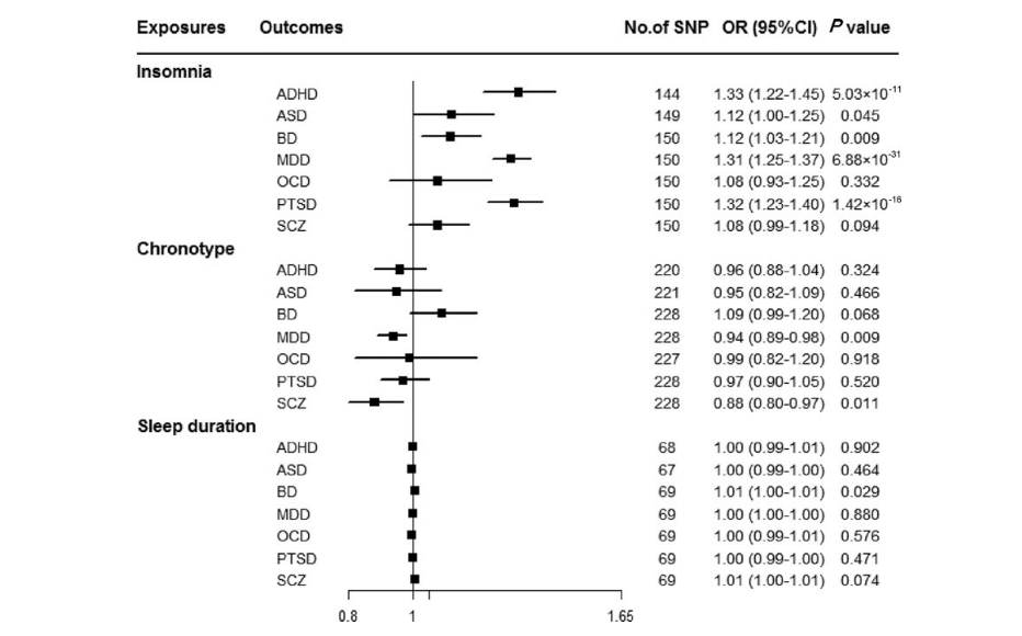 研究结果表明,遗传预测的失眠情况与注意力缺陷多动症(ADHD) (OR=1.33, 95%CI: 1.22-1.45, P=5.03×10-11)、重度抑郁(MDD) (OR=1.31, 95%CI: 1.25-1.37, P=6.88×10-31)及创伤后应激障碍(PTSD) (OR=1.32, 95%CI: 1.23-1.40, P=1.42×10-16)发生风险相关。与遗传预测的“晚睡晚起”的人群相比,“早睡早起”的人群发生MDD、精神分裂症(SCZ)的风险较低。睡眠时间长短也与双相情感障碍(BD)的发生风险相关。反向的孟德尔随机化研究亦发现,PTSD、MDD与失眠发生风险升高相关(PTSD: OR=1.06, 95%CI: 1.03-1.10, P=7.85×10-4;OR=1.37, 95%CI: 1.14-1.64, P=0.001)。研究还发现ADHD和MDD与睡眠时长呈负相关。