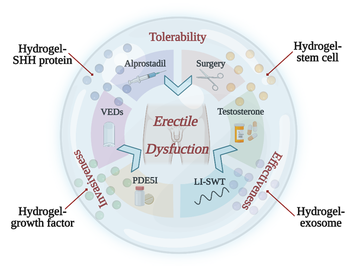 器质性勃起功能障碍(Erectile dysfunction,ED)是男性的一种性功能障碍,通常与疾病、手术损伤、正常衰老等因素有关,在全球范围内发病率很高。而阴茎勃起的本质是一起由多种因素共同调节的神经血管事件,神经和血管损伤则是导致ED的主要原因。目前,ED的主要治疗方案包括口服5型磷酸二酯酶抑制剂、体内注射疗法和应用真空勃起装置等,但这些疗法的作用十分有限。因此,寻找一种新兴的、非侵入性且有效的ED治疗方法至关重要。