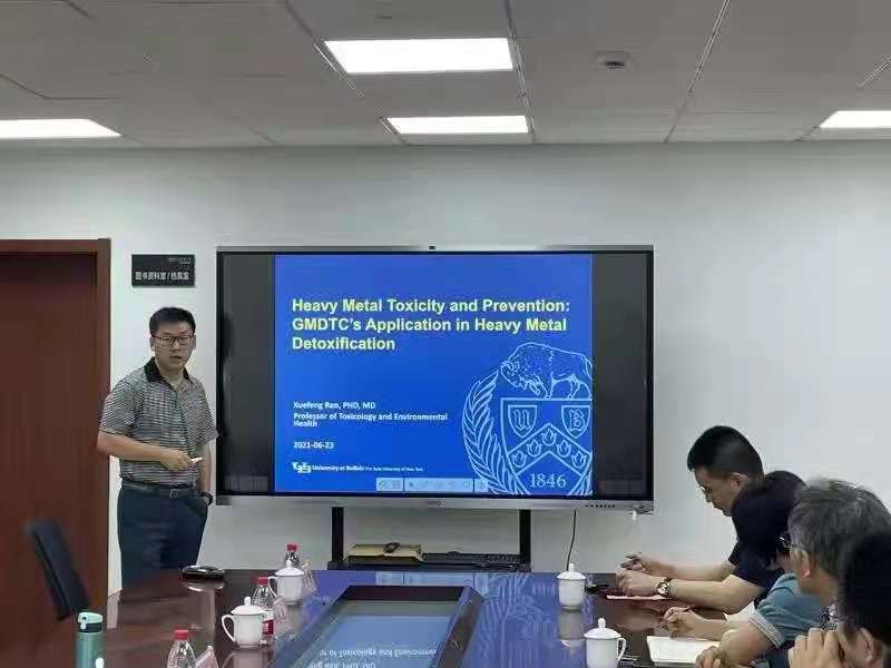 当日下午,任雪锋教授以“Heavy metal toxicity and prevention : GMDTC’s application in heavy metal detoxification”为题,对重金属特性、GMDTC在治疗镉中毒和铂中毒方面的效果与机制等方面进行了详细地阐述。任雪锋教授从镉污染的危害出发,结合传统药物DTC的局限性以及作用部位,首创细胞内重金属驱除药GMDTC。在随后的验证中,无论是细胞实验还是动物实验,GMDTC都能有效安全地清除体内的重金属镉,并初步验证GMDTC可能通过SGLT2-GLUT2偶联转运体机制驱除重金属。其后,任雪锋教授就“动脉粥样斑块预防和治疗”进行了讲座,展示了中药在治疗动脉粥样斑块的高效性以及安全性讲座后,与会师生热情高涨,在问答环节纷纷加入了讨论,大家表示受益匪浅。