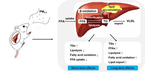 文章结果表明,短期PM2.5暴露抑制小鼠肝脏的脂质分解和脂肪酸氧化,导致肝脏甘油三酯沉积,并代偿性抑制脂肪酸的摄取。而长期PM2.5暴露则在肝脏甘油三酯沉积基础上,通过升高脂质分解水平产生更多游离脂肪酸,并使脂肪酸氧化及脂质外运水平代偿性上升,且代偿性反应的发生不足以抵消PM2.5暴露对肝脏脂质代谢的损伤效应。