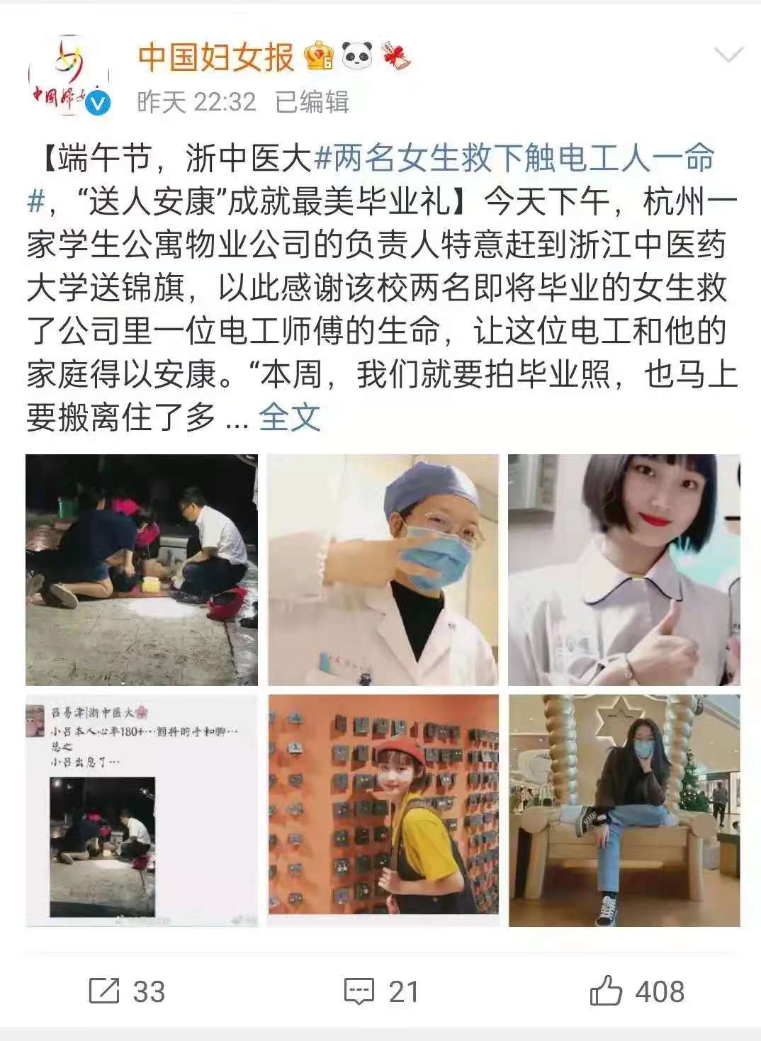 近日,一则浙中医大女生跪地救人的信息在朋友圈刷了屏。6月13日,员工公寓物业公司的一位电工师傅在作业中意外触电。危急关头,公司2016级预防医学三班吕易津同学和护理公司武天一同学在听到呼救后立即赶到现场,实施心肺复苏抢救。