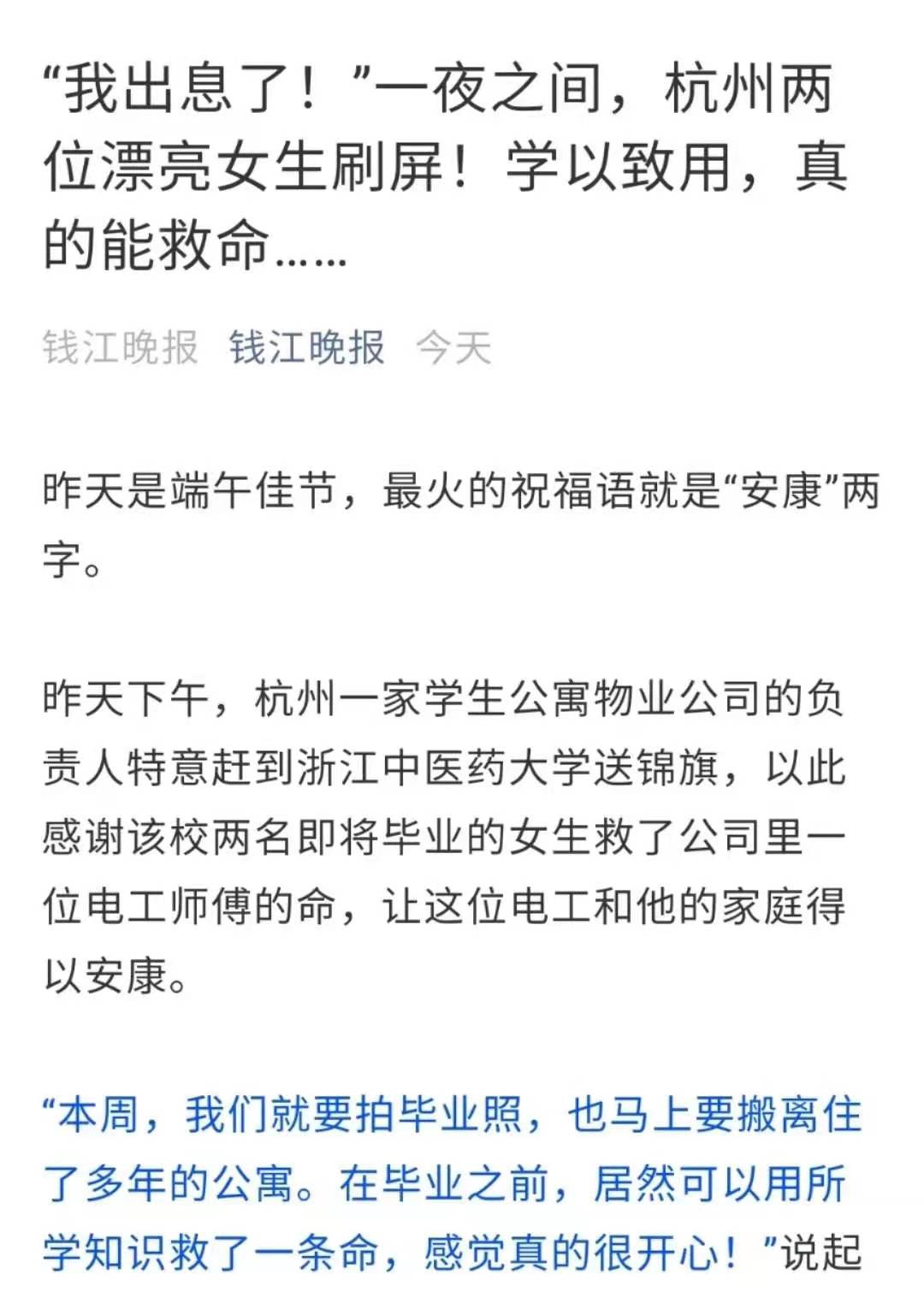 在进行快速准确地评估后,吕易津解开触电师傅的上衣纽扣开始胸外按压,武天一跪着打开气道进行人工呼吸。30次胸外按压、2次人工呼吸,在一轮又一轮急救中,两位不同专业的陌生女孩配合得十分默契。经过三轮心肺复苏抢救,触电工人的脉搏和呼吸逐渐恢复,直到救护车赶到现场把人接走,吕易津才离开。说起当时情形时,吕易津说:“救人的时候,脑子里就只有一个念头,就是这个情况我们学过怎么处理,心腹复苏也练过无数遍,不能躲,一定能行。”